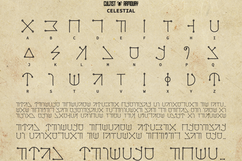Step into the ethereal realm with our "Celestial" display font, a breathtaking interpretation of The Celestial Alphabet, famously known as Angelic Script. Originally brought to life by the renowned Heinrich Cornelius Agrippa in the 16th century, this script transcends ordinary design.
